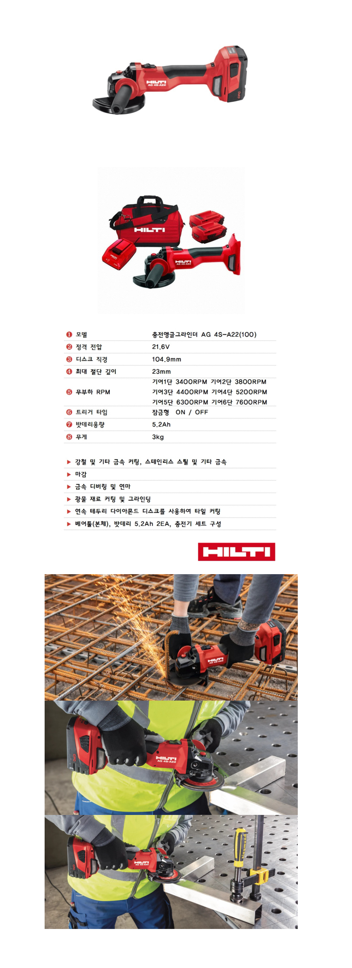 [힐티] 충전앵글그라인더 충전그라인더 22V 5.2Ah AG4S-A22
