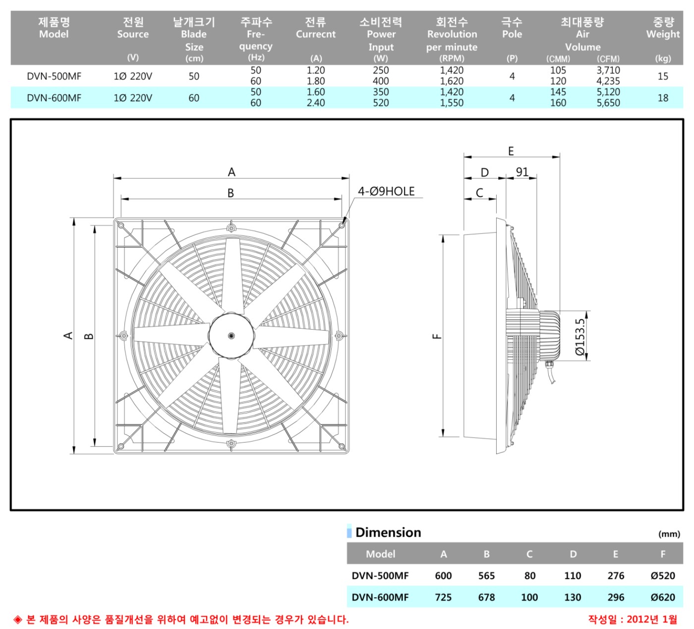 [만승전기] 농축산업용 환풍기 DVN-500MF DVN-600MF