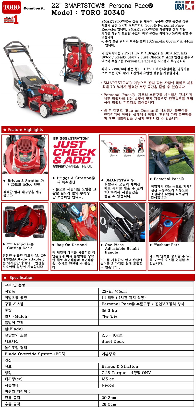 [토로] 제초기 잔디깍기 TORO 20340 후륜구동 Smartstow