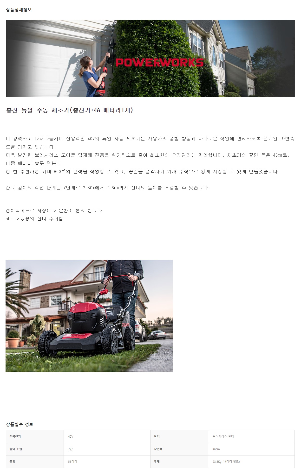 [파워웍스] 충전식 푸쉬형제초기 40V 배터리 5Ah 1개 + 충전기