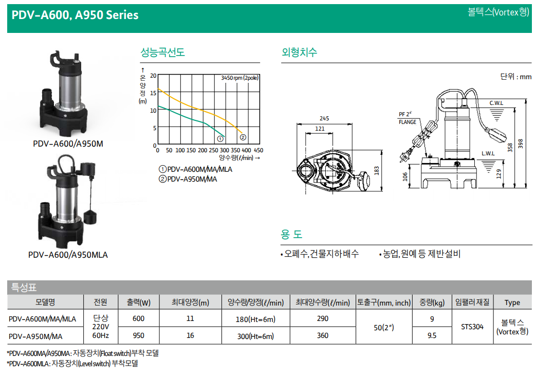 [윌로] 오배수용 수중펌프 PDV-A600M