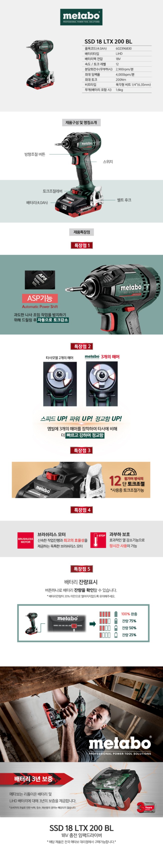 [메타보] SSD 18 LTX 200 BL (18V 4.0Ah) 임팩 드라이버(BL)