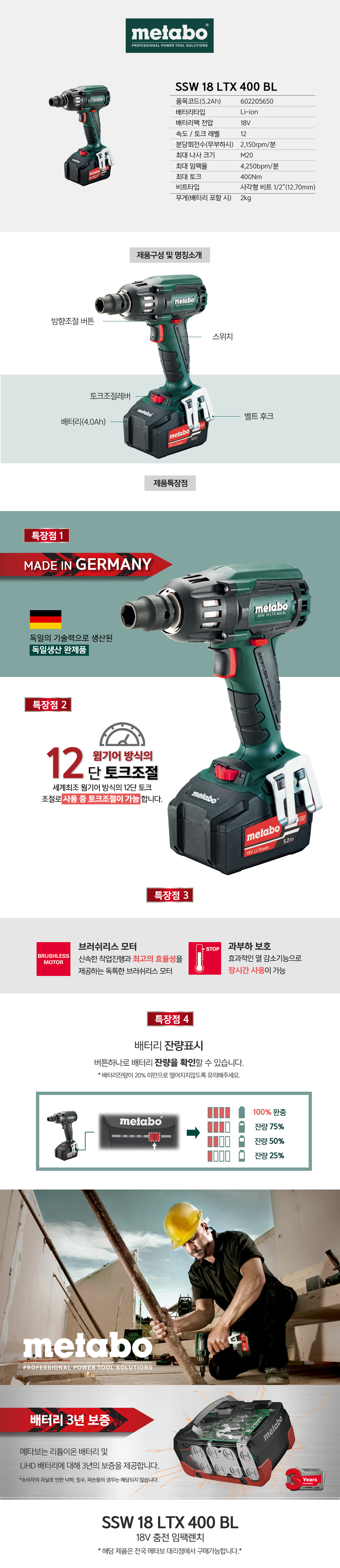 [메타보] SSW 18 LTX 400 BL (18V 5.2Ah) 18V 충전 임팩 렌치 (브러쉬리스타입)